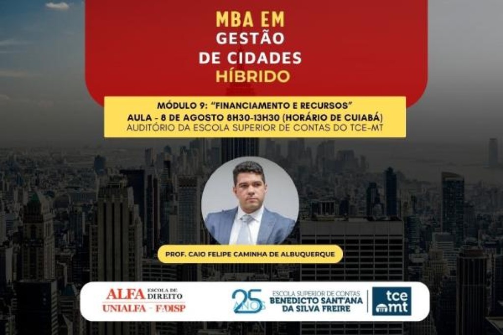 O Tribunal de Contas de Mato Grosso (TCE-MT) realiza o 9º módulo do MBA em Gestão de Cidades, a partir das 8h30 desta sexta-feira (08), no auditório da Escola Superior de Contas. A aula será transmitida ao vivo pelo Canal do TCE-MT no YouTube e pela TV Contas (Canal 30.2).