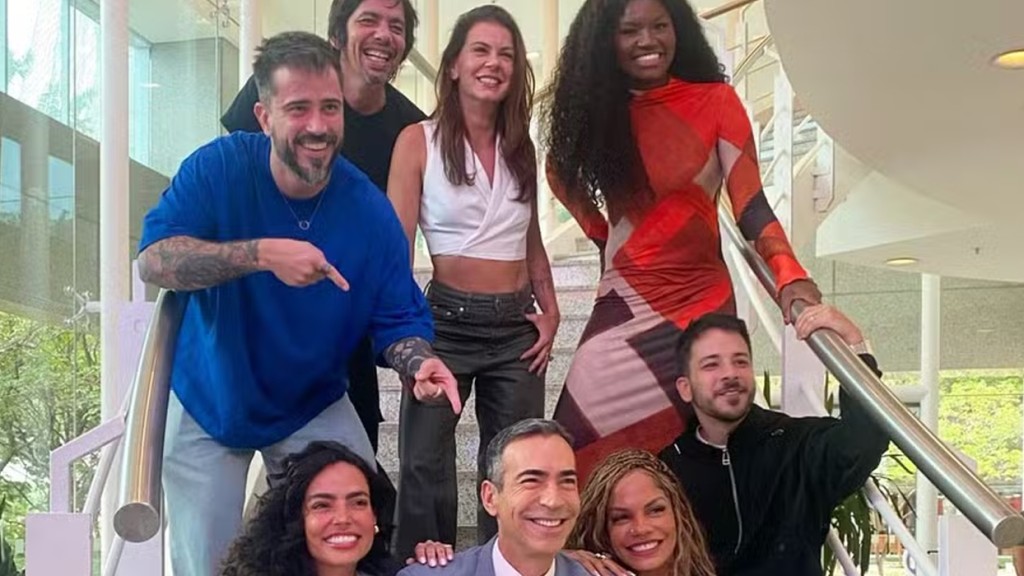 “Das boas surpresas da vida. Sabe aquela foto que você não está esperando nunca? Um encontro improvável com talentos de outra área? Pois olha que demais. Estava indo de um prédio pro outro aqui na firma quando vejo essa turma nota mil reunida, sendo clicada!”, disse o apresentador do Jornal Hoje nas redes sociais.