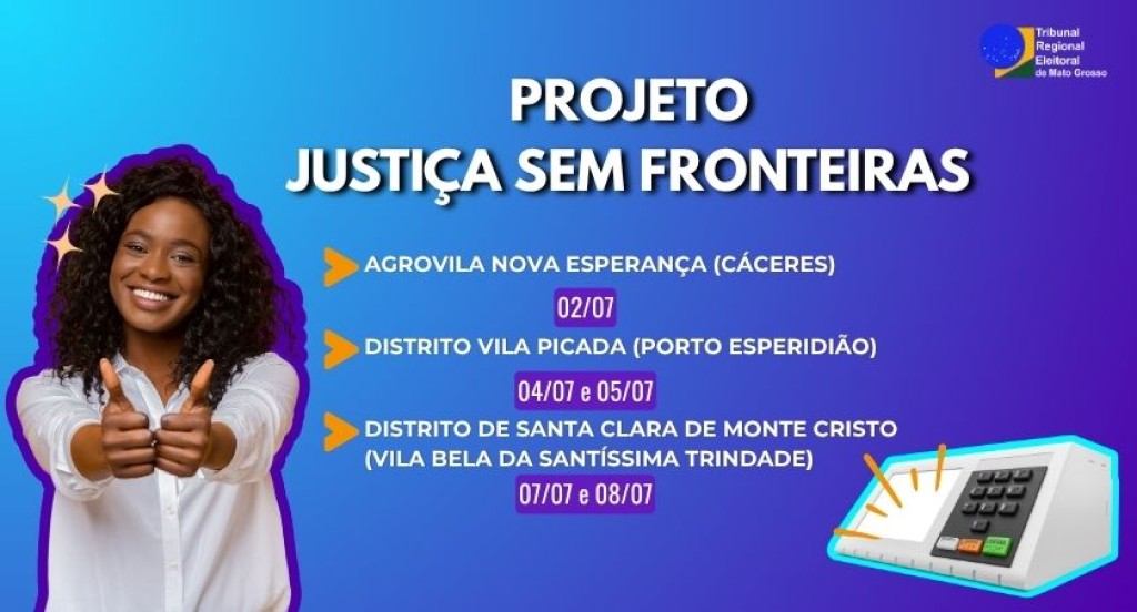 #DescriçãodaImagem: Com fundo azul e roxo, ao lado esquerdo tem uma mulher mulher negra sorrindo enquanto faz sinal de positivo com as duas mãos. Ao lado direito no canto inferior está uma urna eletrônica ao meio está o texto: “Projeto Justiça Sem Fronteiras”. Abaixo estão as localidades com as datas de atendimento.