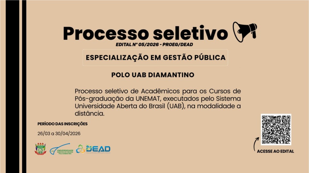 A Universidade do Estado de Mato Grosso (UNEMAT), por meio da Universidade Aberta do Brasil (UAB) Polo de Diamantino, está com inscrições abertas para o processo seletivo do curso de Pós-graduação Lato Sensu em Especialização em Gestão Pública, na modalidade de ensino a distância (EAD).