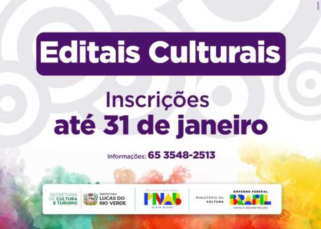 Se você é artista, produtor cultural ou faz parte de um coletivo que movimenta a cena artística da cidade, fique atento que as inscrições para os três editais de chamamento público da Secretaria de Cultura e Turismo terminam nesta sexta-feira (31) e podem ser feitas pelo site oficial da Prefeitura de Lucas do Rio Verde.