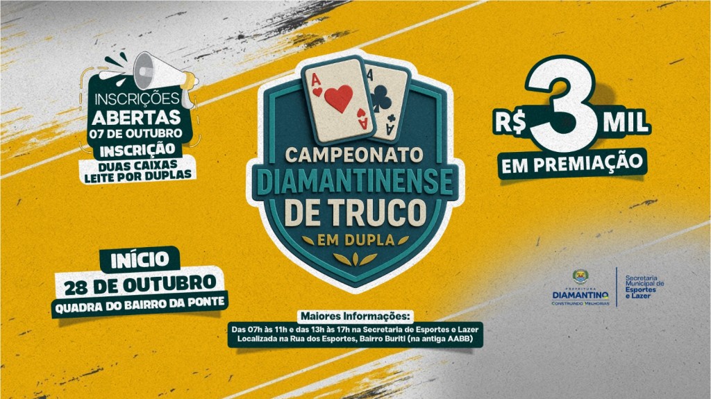 A Prefeitura de Diamantino, por meio da Secretaria Municipal de Esportes e Lazer, irá realizar o 1° Campeonato Municipal de Truco Espanhol, mais uma modalidade que tem como objetivo movimentar a comunidade e oferecer uma nova opção de lazer aos moradores. O evento conta com o apoio do Carol Supermercados.
