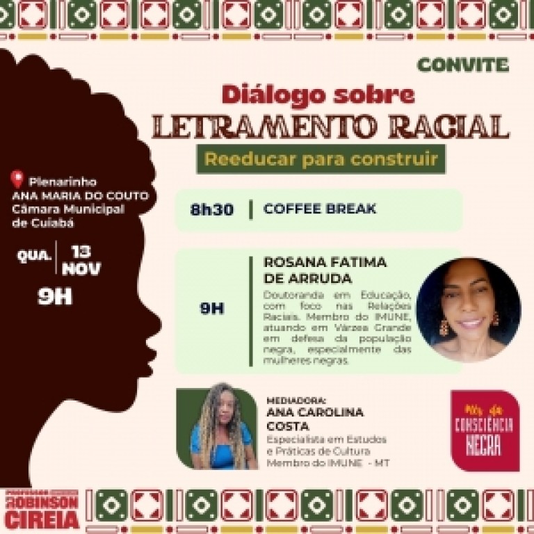 Na próxima quarta-feira, dia 13 de novembro, a Câmara Municipal de Cuiabá será palco de um importante evento promovido pelo vereador Robinson Cireia, que visa discutir e incentivar o letramento racial na sociedade. Intitulado “Diálogo sobre Letramento Racial: Reeducar para Construir”, o encontro acontecerá no Plenarinho Ana Maria do Couto, a partir das 8h30, com um coffee break de boas-vindas, seguido pelo início das palestras às 9h.
